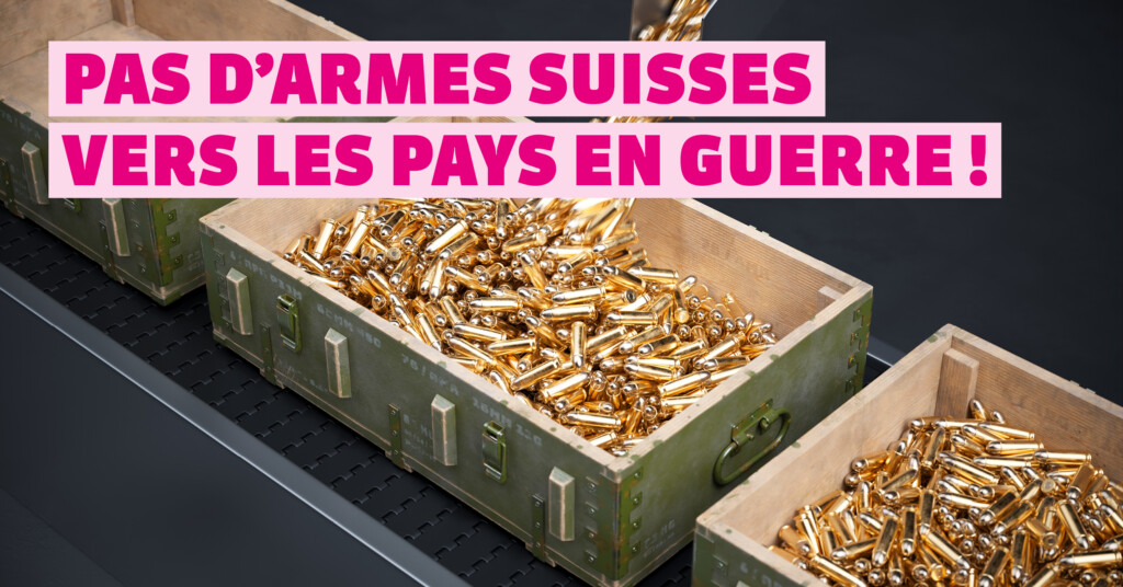 - Le Conseil fédéral et le Parlement veulent faciliter les exportations d’armes suisses vers des pays en guerre. L’exportation de matériel de guerre sera autorisée vers 25 États, même s’ils sont impliqués dans des conflits armés. C’est inacceptable !