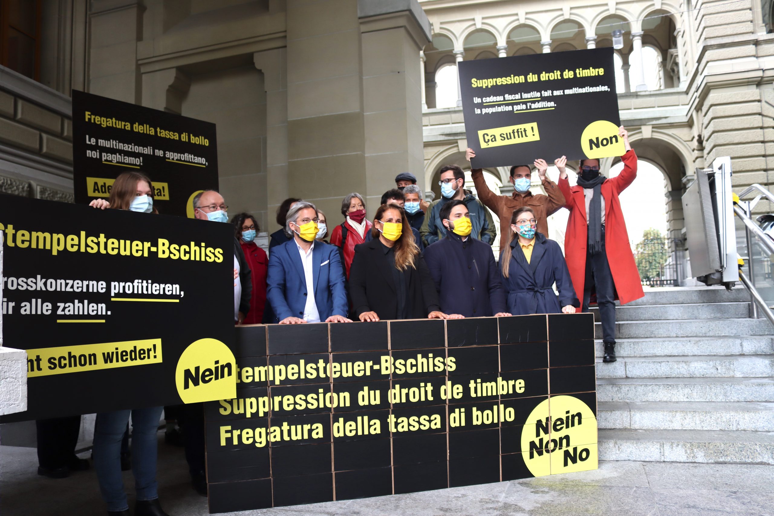 La majorité du parlement voulaient supprimer le droit de timbre en trois étapes. Afin d’empêcher cette tactique du salami, nous avons lancé le référendum contre la première phase de ce démantèlement. Grâce à vos efforts, nous avons pu déposer aujourd’hui ce référendum : un premier succès ! Maintenant, nous devons gagner dans les urnes.